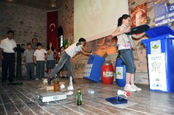 Çevre kirliliğine sebep olan atık pil, bitkisel, elektronik ve evsel atıkların, doğaya rast gele atıldığında çevreye verdikleri zarar ve yok olma sürelerinden bahseden Durabay, öğrenciler arasında bir de yarışma düzenledi. Salonda bulunan öğrencilerden 2’şerli 3 grup oluşturun Durabay, renkli görüntülere sahne olan yarışmada, sahneye rastgele atılan bitkisel, evsel, atık pil ve elektronik atıkları en kısa sürede toplayıp, atık toplama kutularına doğru şekilde atan yarışmacılara, çeşitli hediyeler verdi.