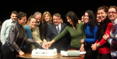 Bursa Büyükşehir Belediyesi Şehir Tiyatrosu sanatçıları 7. yıl sevincini sahnede pasta keserek kutladı.