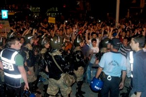 Eylemcilerden kimisi askerlerle hatıra fotoğrafı çektirirken kimisi de 'askere uzanan eller kırılsın' diye slogan attı. Yaklaşık 6 bin eylemci, saatlerce slogan attı. Kalabalık grup, 'Hükümet istifa', 'Askere vuran eller kırılsın' sloganları atıyor. Tencere ve tavalarla slogan atan kalabalık, protestolarını sürdürüyor.