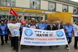 Bursa PTT Başmüdürlüğü binası önünde toplanan postacılar, yıpranma hakkı ve PTT’nin anonim şirkete dönüştürülmesine tepki olarak Ankara’ya yürüyüşe geçecek olan meslektaşlarına destek verdi. Yürüyüş öncesi değerlendirmelerde bulunan Türk Haber-Sen Genel Başkanı İsmail Karadavut, postacıların yıpranma haklarının 2006’da hayata geçirildiğini, ancak 2007’de yeniden iptal edildiğini söyledi. TBMM’de yıpranma hakkının kaldırılması için oy kullanan milletvekillerine haklarını helal etmediklerini belirten Karadavut, “İki asırdır bu millete kaliteli, hızlı, sürekli hizmet veren PTT’miz şimdi anonim şirketi yapılmak isteniyor. Daha önce ülkemizde yüzlerce kurumun bugün adı silinmiştir, yok edilmiştir. PTT de bu şekilde olacaktır, bizim üzüntümüz bunadır. PTT AŞ’ye karşıyız. Her türlü tepkimizi ortaya koyduk. Hükümet, kimseyi dinlemiyor. ‘Bu insanlar neden tepki gösteriyorlar?’ diye sormuyor. Bize danışılmadan bu tasarı hazırlandı. Bugün de Mecliste görüşülecek. PTT, AŞ olduğu zaman özelleştirmenin önü açılacak, iki asırlık kurumlar elimizden gidecek. Bunun gitmesini istemiyoruz. PTT’miz bu millete en ücra köşelerde bile hizmet vermektedir. PTT’nin özerk hale getirilmesini istiyoruz. Kadrolu personel çalıştırılmasını istiyoruz, köle çalıştırılmasını istemiyoruz., tepkimiz bunadır.” diye konuştu.