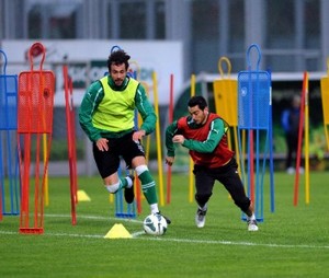 Isınma hareketleriyle başlayan antrenman, dar alanda çubuklu gölge savunmalı bire bir ve ikiye iki çalışması devam etti. Yeşil-beyazlılar, daha sonra yarı sahada çift kale maç ile çalışmayı tamamladı.