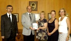 Bursa Uluslararası Kadınlar Derneği Başkanı Maria Kaytancıoğlu ve üyeler Caroline Walker ile Sybille Wohlfarth ziyarette, Rektör Prof. Dr. Kamil Dilek’e dernek üyelerinin ülkelerinin yöresel ve sevilen yemek tariflerinden derleyerek bastırdıkları Dünyanın Yemekleri adlı kitap hakkında bilgi verdi.