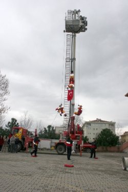 Konuşmaların ardından okul bahçesinde İnegöl İtfaiye Müdürlüğü tarafından hazırlanan tatbikat sunumu gerçekleştirildi. Tatbikatı öğrenciler ve protokol üyeleri ilgiyle izledi.