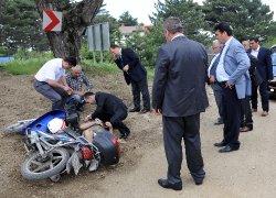 Bursa Uludağ'da kaza yapan motosiklet sürücüsüne ilk müdahaleyi Osmangazi Belediye Başkanı Mustafa Dündar’ın koruması yaptı.