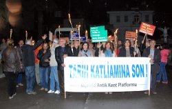 Daha sonra Halk Meclisi Derneği’nden iki üyenin seslendirdiği türküler ardından meydanda toplanan platform temsilcileri, açtıkları 'Tarih katliamına son' pankartıyla Mütareke Meydanı’ndan İskele Meydanı’na kadar sloganlar eşliğinde yürüyüş yaptı.