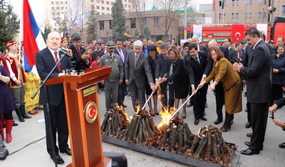 Vali Koçdemir ve beraberindeki heyet daha sonra Nevruz ateşinin yakılacağı alana geldi. Tüm insanlığa barış ve huzur getirmesi dilekleriyle Nevruz ateşi yakıldı. Ardından Nevruz heyeti, demir döverek geçmişi yad etti. Türk dünyasının farklı ülkelerinden gelen halk oyunları ekibinin gösteri yaptığı etkinliğe katılanlara Nevruz aşı ikram edildi.