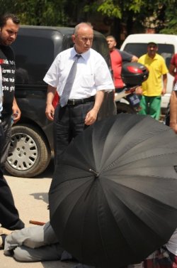Otomobilin çarptığı yaşlı şahsa şemsiyeli koruma