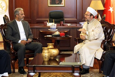 Diyanet İşleri Başkanı Prof. Dr.Mehmet Görmez, kendisine nezaket ziyaretinde bulunan İran’ın Ankara Büyükelçisi Ali Rıza Bigdeli ve beraberindeki heyeti makamında kabul etti. Diyanet İşleri Başkanı Görmez, “Siyasi olan sorunların mezhep rengine bürünmesi endişe vericidir. Bu bir gerçeklik ifade etmiyor. Hem Türkiye hem İran etrafında olup bitenleri çok iyi okuyarak gelecek nesillere barışı taşımanın yollarını aramalı”dedi.