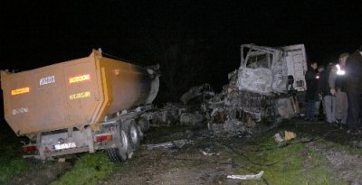 Kaza saat 21.00 sıraları Bursa – İzmir karayolunun 33. kilometresi Karakoca köyü mevkiinde meydana geldi. İddiaya göre Bursa yönünden gelen H.Hüseyin Güleç yönetimindeki 10 H 7883 plakalı gübre tankeri, orta bariyerleri aşarak karşı yönden gelen Ahmet Döne’nin kullandığı 06 DM 8410 plakalı TIR’la kafa kafaya çarpıştı. Bir anda alev topuna dönen TIR'ın içindeki Ahmet Döne, yanarak feci şekilde olay yerinde can veridi. Bursa ve Karacabey’den gelen itfaiye ekipleri yangını kısa sürede söndürdü. Kazada yaralanan tanker sürücüsü ise 112 Acil Servisi’nin ilk müdahalesinin ardından Karacabey Devlet Hastanesi’ne kaldırılarak tedavi altına alındı.