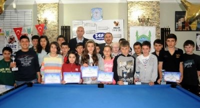 5, 6, 7 ve 8. sınıflardan 7’si kız, 33’ü erkek toplam 40 bilardocunun katıldığı turnuvada şampiyonluğu, Tatkavaklı Ortaokulu öğrencisi Metehan Engin kazandı. Turnuvanın ikincisi ve üçüncüsü aynı okuldan Mert Engin ve Emre Engin olurken, dördüncülüğü ise Yunus Emre Ortaokulu’ndan Samet Engin elde etti.
